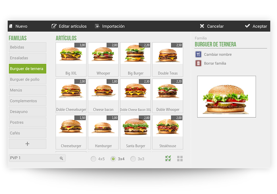 Evita costes de puesta en marcha de tu restaurante con nuestra herramienta de creación de productos por galería. Selecciona tu tipo de negocio y encuentra a disposición y en un solo clic más de 2000 referencias de productos, con imágenes de producto y ordenadas y clasificadas por familias.